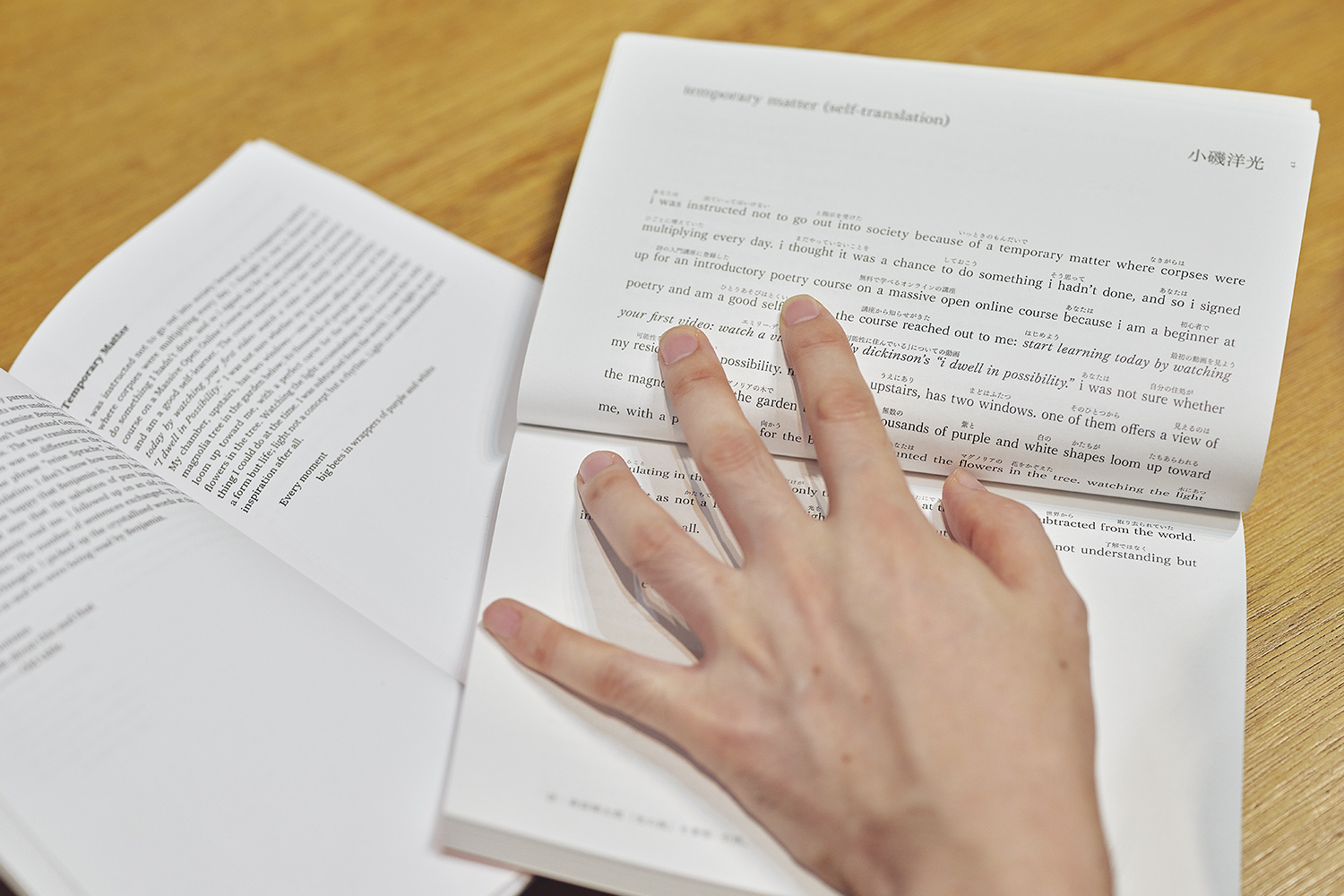 初めて雑誌に載った詩は、2回目の留学中に英語で書いた作品です。『Poetry』という、アメリカの文芸誌に載りました。『現代詩手帖』にも詩を発表する機会があり、『Poetry』に掲載された英語の詩に、その日本語訳をルビとして振り、英語と日本語が混在するように仕上げました。ただし、英語と日本語の対応に少し工夫を加えました。こんなふうに、翻訳を創作の手法とすることを、2回目の留学時に研究したんです。これからも取り組んでいきたいです。