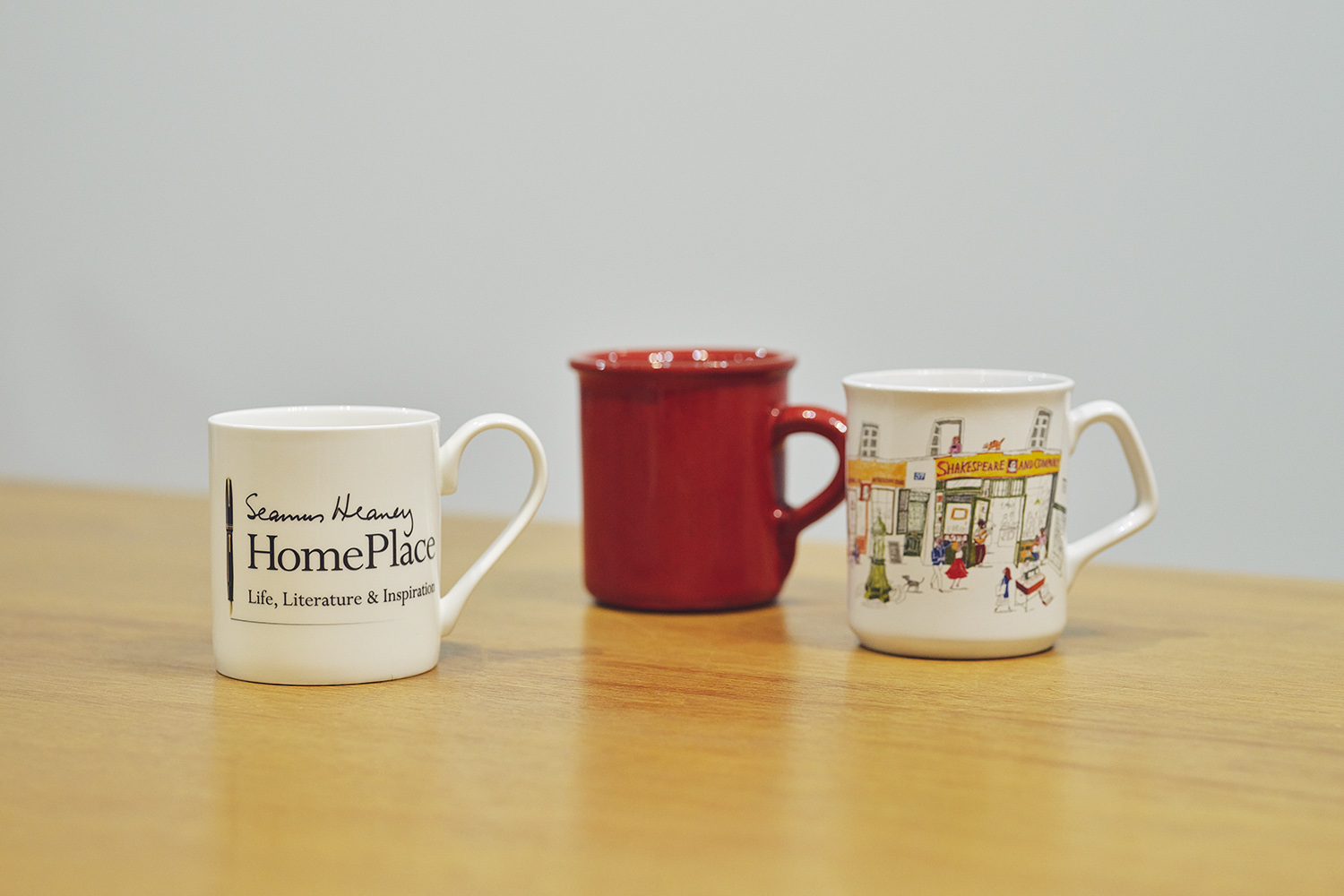 旅行に行ってもあまりおみやげを買わないのですが、友人からよくマグカップをもらいます。この三つは、左からそれぞれ、アイルランドの「シェイマス・ヒーニー・ホームプレイス」、バルセロナの雑貨屋さん、パリのシェイクスピア・アンド・カンパニー書店のおみやげです。海外のものを使いながら翻訳をすると、気分がちょっと高まります。